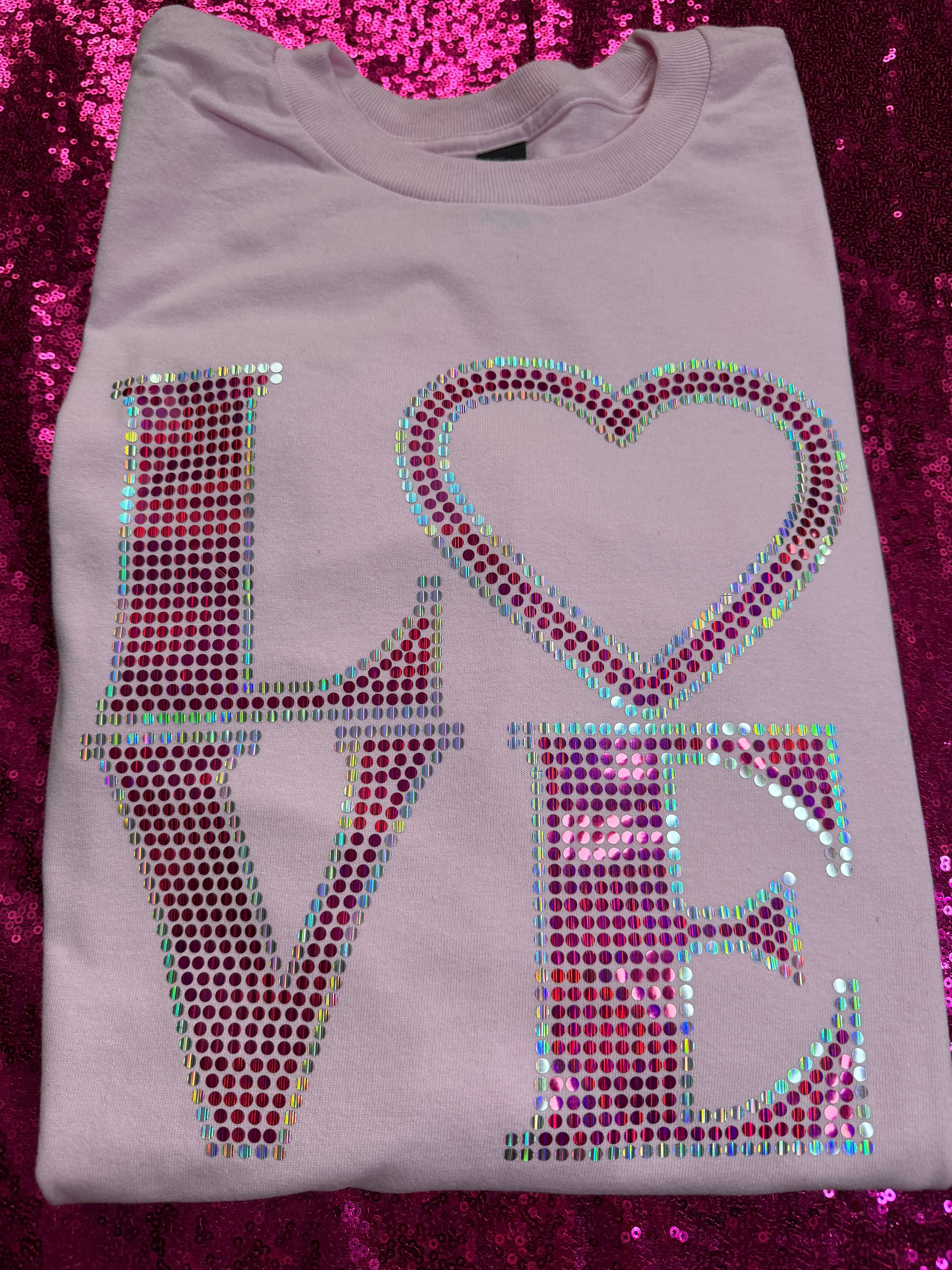 Our LOVE Spangles Top is the perfect mix of bold, fun, and feel-good energy. Featuring oversized LOVE lettering made entirely of high-shine spangles, this piece catches the light from every angle and turns a simple outfit into a statement.